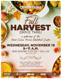 Center Table Fall Harvest to provide Thanksgiving meals for 3,000 North Texans on Wednesday, November 19, at Mark Cuban Heroes Basketball Center - As thousands of Dallas families are feeling the squeeze, the sixth annual event will provide approximately 800 Thanksgiving meal boxes to households this holiday season