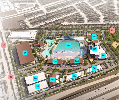 At the center of the development will be a resort-style hotel featuring best-in-class accommodations, event and wedding venues, and a sandy beach. Guests will enjoy cabanas and lounge areas with food service, directly connecting them to the surf lagoon and water attractions such as cliff diving and a stationary surf wave. Plans also include a skateboard park, movie theater, bowling alley, health club and indoor recreation facilities.