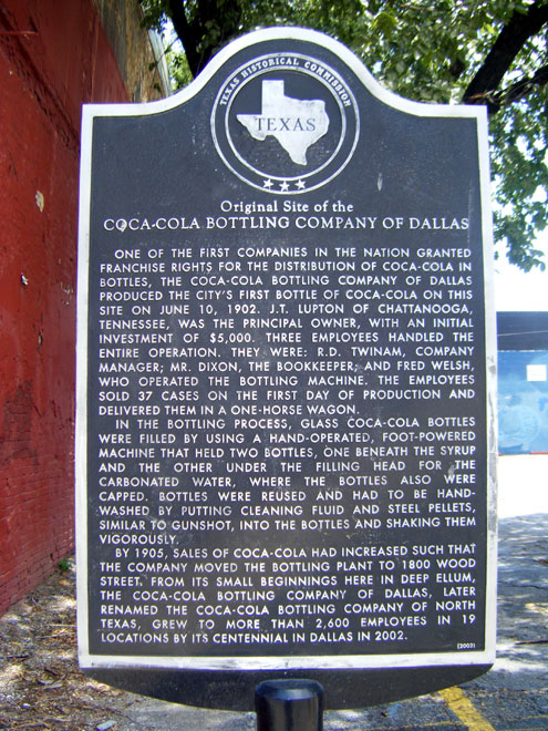 One year earlier, John T. Lupton had opened a Coca-Cola bottling plant in Dallas at 2628 Elm Street. A Texas State Historical Marker now notes the spot.