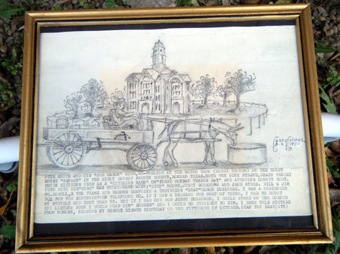 The courthouse appears to have a rope fence around it, the streets are dirt and a horse is taking a drink of water that came from one of the many wells located on the square. Grimes drew the sketch in 1980 at the age of eighty-eight.