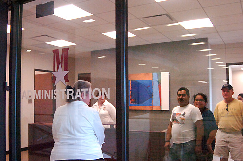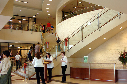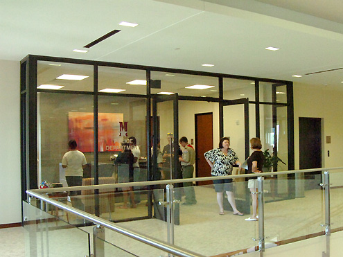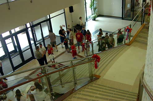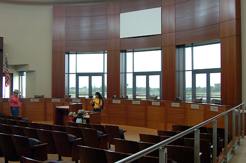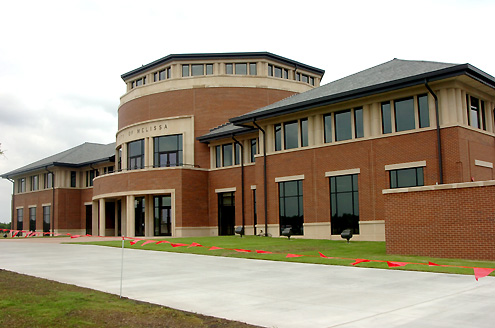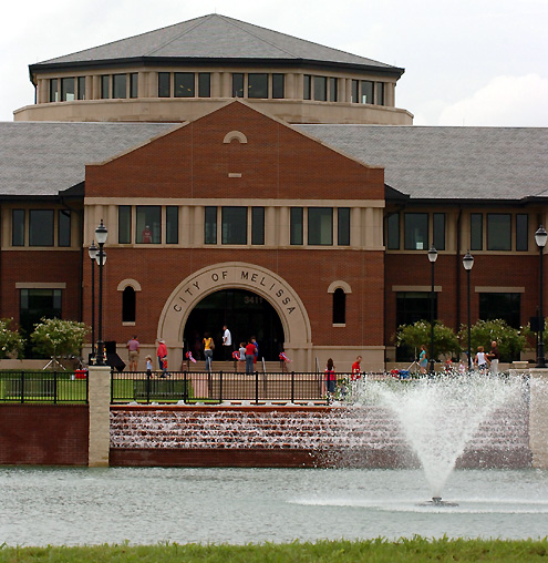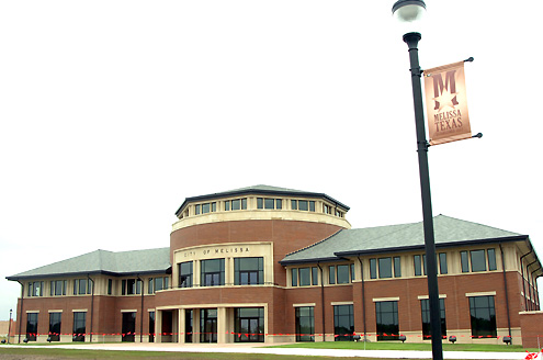 Four departments were brought under one roof in the spacious complex that also contains the Melissa Public Library. The municipal courtroom and library dominate the first floor of the building. City administration, Melissa Police Department, a community meeting room and a spectacular city council chambers are all located on the second floor. The Melissa City Council can conveniently exit the towering council chambers and enter a much smaller room to privately deliberate during executive sessions.