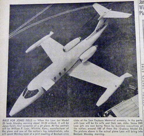 The front page of the Friday, February 12, 1971 Bonham Daily Favorite reported that Lear would land in his private jet at Jones Field the following Monday.