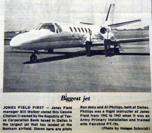 The front page of the October 24, 1980 Daily Favorite carried a photograph and brief story on the landing that day of a Cessna Citation II that belonged to the Republic of Texas Bank Corporation. One of the pilots, Al Phillips of Dallas, was no stranger to the area. He had worked at Jones Field as a flight instructor during World War II.