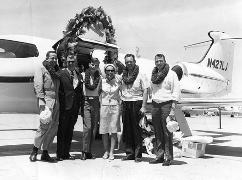 According to the February 16 Daily Favorite, Lear landed his Model 25 Lear Jet at roughly 10:30 Monday morning. He and his wife, Moya, and youngest son, John and another guest were then greeted by a sizable crowd at the airport.