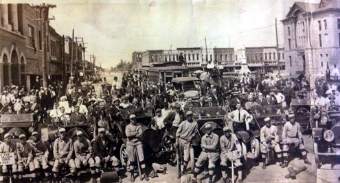 This photo, taken April 15, 1913, shows John W. Russell's electric trolley cars in the middle of the crowd. (Photo courtesy of Fannin County Historical Museum.)