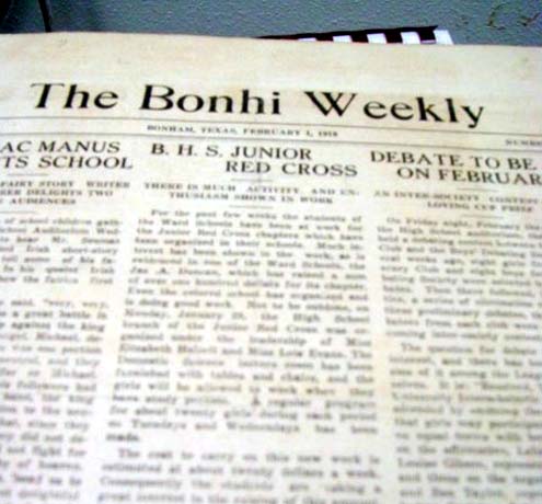 The lead story in one particular Bonhi Weekly issue involved a visit by Irish folklorist Seamas Mac Manus. The setting for this speech was the Bonham High School Auditorium, a large room on the second floor of the old high school building that later became the library.