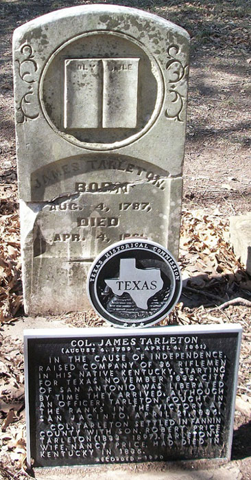 James Tarlton was born in Kentucky in 1787. In November 1835 he came to Texas in command of a company of 36 volunteer riflemen from Kentucky. The Alamo had already fallen when the company reached Texas. General Sam Houston sent Captain Tarleton to Goliad with dispatches for Col. James Fannin. He was one of Sam Houston’s staff officers and was on the battlefield at San Jacinto.