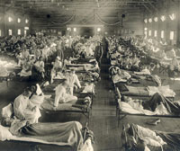 1918 – A case of influenza was recorded at Camp Funston, Kansas, conventionally marking the beginning of the worldwide Spanish flu pandemic. The 1918–1920 flu pandemic, also known as the Great Influenza epidemic or by the common misnomer Spanish flu, was an exceptionally deadly global influenza pandemic caused by the H1N1 subtype of the influenza A virus. The earliest documented case was March 1918 in Haskell County, Kansas, United States, with further cases recorded in France, Germany and the United Kingdom in April. Two years later, nearly a third of the global population, or an estimated 500 million people, had been infected. Estimates of deaths range from 17 million to 50 million, and possibly as high as 100 million, making it one of the deadliest pandemics in history. The pandemic broke out near the end of World War I, when wartime censors in the belligerent countries suppressed bad news to maintain morale, but newspapers freely reported the outbreak in neutral Spain, creating a false impression of Spain as the epicenter and leading to the "Spanish flu" misnomer.[10] Limited historical epidemiological data make the pandemic's geographic origin indeterminate, with competing hypotheses on the initial spread. Most influenza outbreaks disproportionately kill the young and old, but this pandemic had unusually high mortality for young adults. Scientists offer several explanations for the high mortality, including a six-year climate anomaly affecting migration of disease vectors with increased likelihood of spread through bodies of water. However, the claim that young adults had a high mortality during the pandemic has been contested. Malnourishment, overcrowded medical camps and hospitals, and poor hygiene, exacerbated by the war, promoted bacterial superinfection, killing most of the victims after a typically prolonged death bed.