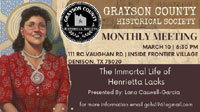 Grayson County Historical Society will be celebrating Women's History Month at their meeting on Tuesday March 10, 2026 at 6:30 p.m. and the organization has invited Lana Caswell-Garcia to present her program "The Immortal Life of Henrietta Lacks." After Lacks's death, scientists made her immortal because her cells were taken without consent and have been used in saving many lives. Lacks died at the age of 31 in 1951.