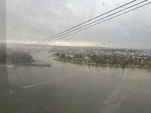 We venture further up the Rhine to Koblenz, where we “park” on the other side of the river and take a cable car to the city. It is raining, but we can still see where the Moselle joins the Rhine. The converging waters are different colors.