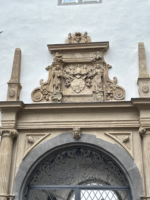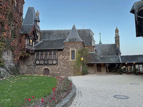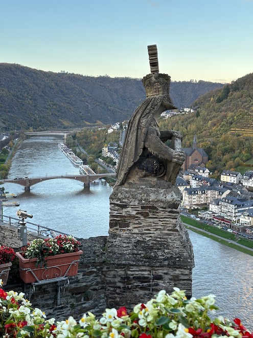 That afternoon, we stopped at Cochem for a walking tour and a visit to the Reichsburg Castle. Built around 1000 AD for defense, it has had its ups and downs, being destroyed in the 17th century. In 1868, it was bought and reconstructed into a Neo-Gothic style popular at the time. Located high on a hill, it is an imposing structure. At night, it is lit up, like a fairy tale castle.