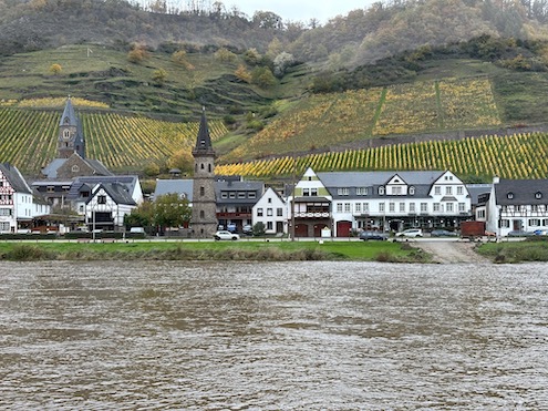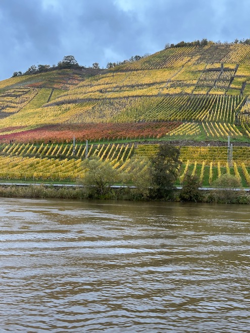 I have been to vineyards in many geographic areas, but I wasn’t prepared for the steepness of those along the Moselle. One vintner we met joked that they are now born with one leg shorter than the other so they may properly harvest the grapes.