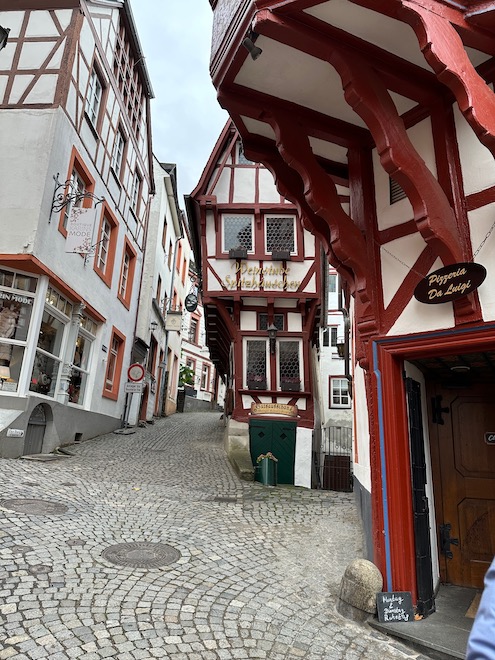 The ship didn’t move that night in Cochem, but early the next morning we did. There were damaged locks ahead so we took bus tours. First stop was Trier, Germany’s oldest city, originally a Celtic settlement. In 16 BC, the Romans conquered it, and it later became the “Rome of the North.” An important base for the Romans, it has many UNESCO World Heritage designations with Roman structures still standing, including the Porta Negra City Gate. After lunch on our own (don’t laugh, burgers and chili, with a very nice German wine served by the winemaker), we boarded another bus and journeyed to Bernkastel, a charming city of half-timbered houses where we had a wine tasting.