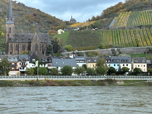Then, finally—castle day! It wasn’t like we hadn’t had wonderful scenery along the rivers, but today was the day to turn your head from side to side, seeing a new (well, okay, old) castle/fortification. These weren’t the fairy tale Cinderella castles we think of when we think of German castles, but castles they were. Some of them levied customs to ships passing on the river. Others guarded themselves from encroaching entities. Two saw brother set against brother over the love of a woman. In the middle of these thirty castles would be the Lorelei Rock, an imposing 433-foot steep slate rock. It honors the story of the Loreley, a siren who would lure sailors to their death. On the right bank of Rhine is a statue to her and a visitor’s center on the cliff top above.