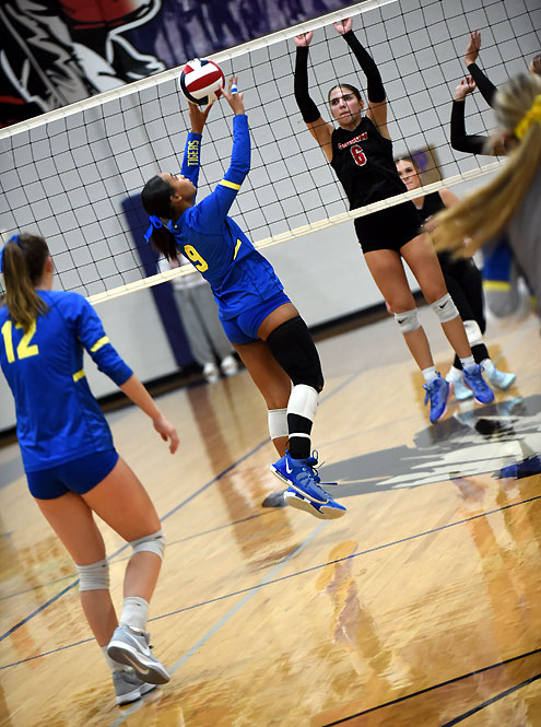 Brown led the front-line defense with two blocks and Neaville had a timely block to end the first set.