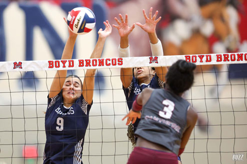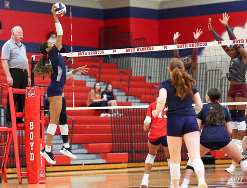 McKinney Boyd's Keira Bose (9) blocks against Princeton on Friday, September 26, 2025 at McKinney Boyd High School.