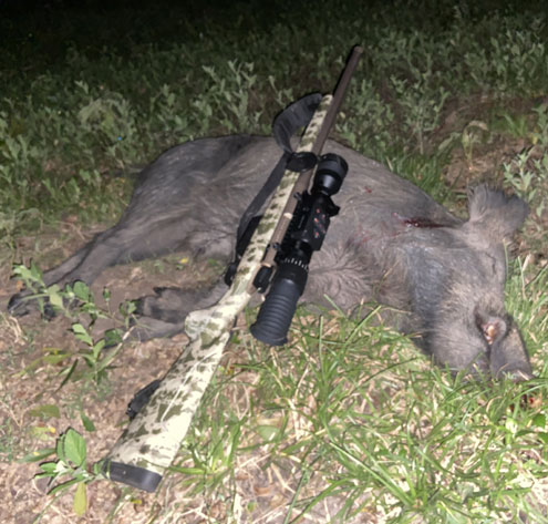 The next evening I was back with a vengeance! After a short 45-minute sit I heard water splashing in the nearby slough. It was the boar and he was back on the far side of the fence to enjoy more green pecans. I watched him for a good 10 minutes and fully expected him to head for the corn on the ground under the feeder. When he began to feed farther away, I settled the ATN Thor thermal scopes crosshairs on the hog and squeezed the trigger.