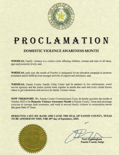 Commissioners court approved a Proclamation stating the month of October 2025 to be Domestic Violence Awareness Month in Fannin County to encourage everyone to increase their awareness, and work to prevent family violence in communities across Texas.