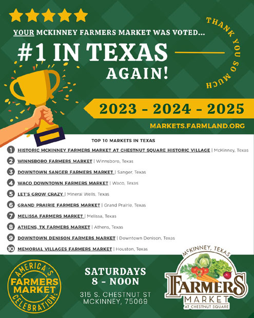 “We’re honored that the McKinney Farmers Market at Chestnut Square has been named the #1 Farmers Market in Texas and #3 in the Southwest,” says DeAnna Stone, Development Director. “This recognition belongs to our amazing vendors, staff, volunteers, and community who make the market a place to gather, grow, and celebrate together. It is a perfect reflection of the beauty of community. Thank you, McKinney!”