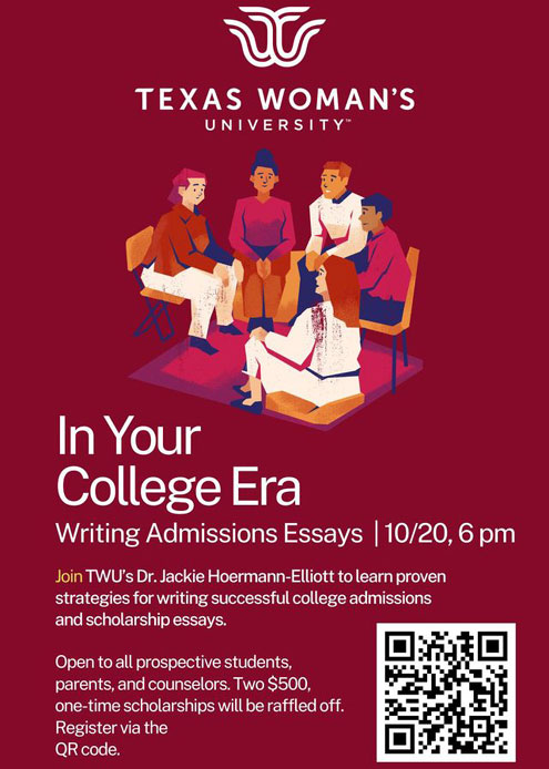 Denton, Texas -- Texas Woman’s University will host In Your College Era: Admissions Essay Writing Workshop, a free webinar designed to demystify the essay-writing process for high school seniors, parents and counselors. The session will break down college admissions and scholarship essays step by step, offering proven storytelling techniques, common pitfalls to avoid, tactics to combat procrastination, and guidance on AI — when it’s a helpful tool, and when it should be set aside. Participants will leave with insights they can immediately apply to their own essay-writing journey.