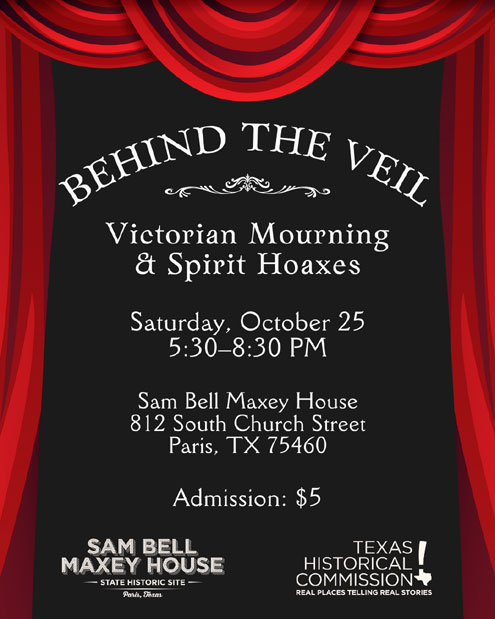 Paris, Texas –– The Sam Bell Maxey House State Historic Site invites visitors to uncover the mysteries of the Victorian era during this year’s Maxey After Dark event, “Behind the Veil: Victorian Mourning and Spirit Hoaxes,” on Friday, October 25, from 5:30 to 8:30 p.m. During the Victorian period, grief and curiosity about the afterlife often intertwined.