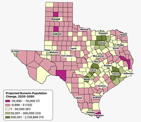 Projected Numeric Population Change for Texas Counties, 2020-2060