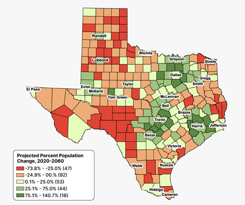 Projected Percent Population Change for Texas Counties, 2020-2060