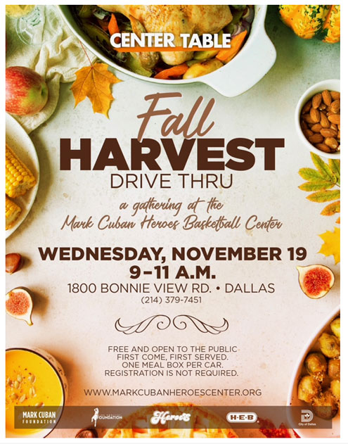 Center Table Fall Harvest is presented by H-E-B, The Mark Cuban Foundation, The Dirk Nowitzki Foundation, The Heroes Foundation and the City of Dallas Office of Arts and Culture.