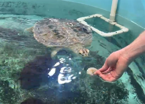 Visitors may also spot Pickles, a resilient green sea turtle and patient in the Sea Turtle Hospital at the aquarium. Pickles is missing his left flippers due to a predator attack that has left him unable to return to the ocean, but that doesn’t stop him from enjoying his favorite treat, a shrimp, as part of his individualized care and rehabilitation.