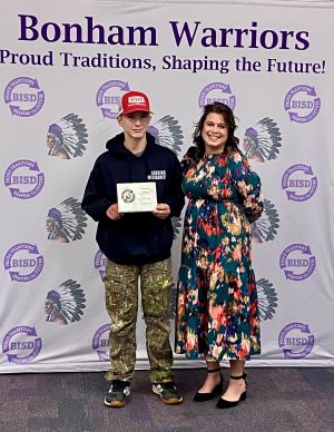 BHS Seniors of the Month are Sarah Story and Cullen Frazier. Story has been in Bonham since fifth grade and participates in band, robotics and debate. Future plans include becoming a speech therapist and going to Texas Women’s University. Teachers describe her as warm, funny and inclusive.