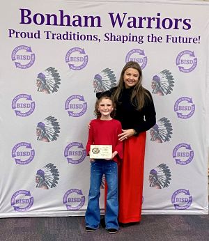 Finley Oates Student of the Month is Raelynn Stewart. She is a third grader who has been in Bonham schools since pre-k. She loves to learn and science is her favorite subject. She also enjoys being creative and art. Teachers describe her as an excellent student who is a delight to have in class and a hard worker.