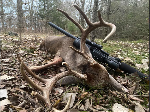 Again, I activated the video camera on in the scope and nudged the rifle’s safety off. The shot was good and I watched the buck disappear down the well-used game trail that it came in on. The shot was at a mere 27 yards, more like bow range than rifle. I was positive the shot was good and that I’d find my Christmas venison a few yards down the trail. Darkness was about to fall and I gambled and immediately followed the trail to the buck. It’s always best to wait a few minutes after the shot but I guessed right and made an easy recovery.
