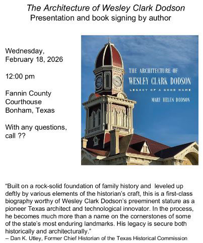 Bonham, Texas -- On Wednesday, February 18 at 12:00 p.m., Mary Helen Dodson - a historian, author, and great granddaughter of her subject - will be at the Fannin County Courthouse to present her just-published book, The Architecture of Wesley Clark Dodson: Legacy of a Good Name.