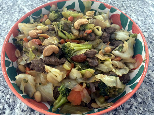 Add the marinated steak pieces first, along with the liquid marinade. The meat will be done in about five or six minutes. Next add the veggies and stir to blend everything together. I usually add a bit more stir-fry sauce to ensure the veggies remain moist while cooking. On high heat, it only takes a few minutes for the veggies to cook. You want them slightly crunchy rather than fully cooked. I usually toss in a handful of nuts to add a bit of extra crunch to my stir fry.