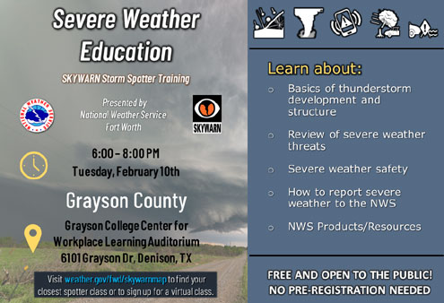 Grayson County, Texas -- The 2026 spring severe weather season is not too far away, and the National Weather Service and local public safety officials want you to be ready. The National Weather Service (NWS) Office located in Fort Worth will be conducting a free Severe Weather Education class in Grayson County on Tuesday, February 10, 2026, from 6:00 p.m. to 8:00 p.m. at the Grayson College Center for Workplace Learning Auditorium in Denison.