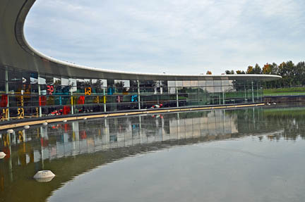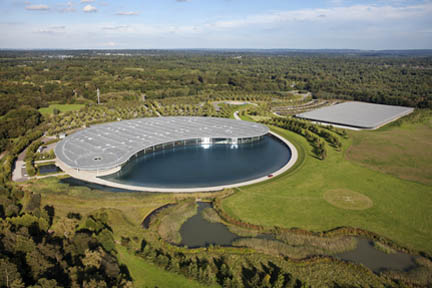 When McLaren converted the former ostrich farm into their global headquarters in 2004, they planted more than 100,000 trees and shrubs. The man-made lake holds 30 million liters (about 8 million gallons) of water, which circulates through heat exchangers to cool the building and dissipate heat produced in the wind tunnel.