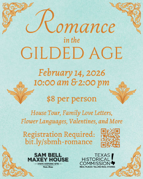 Paris, Texas –– The Sam Bell Maxey House State Historic Site will celebrate Valentine’s Day with a special guided tour, “Romance in the Gilded Age”, on Saturday, February 14, at 10:00 a.m. and 2:00 p.m.
