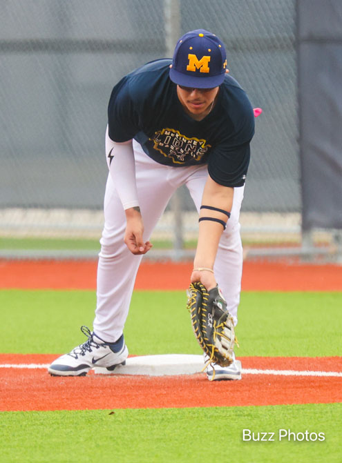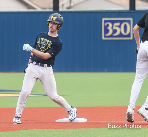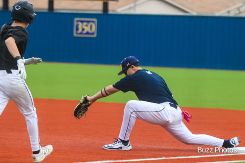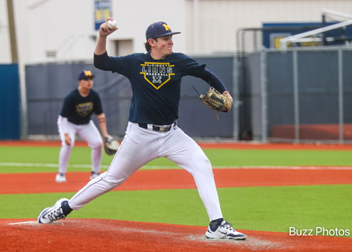 Lions pitcher Hank Valek fires the ball for the first pitch at the last scrimmage before the season opener.