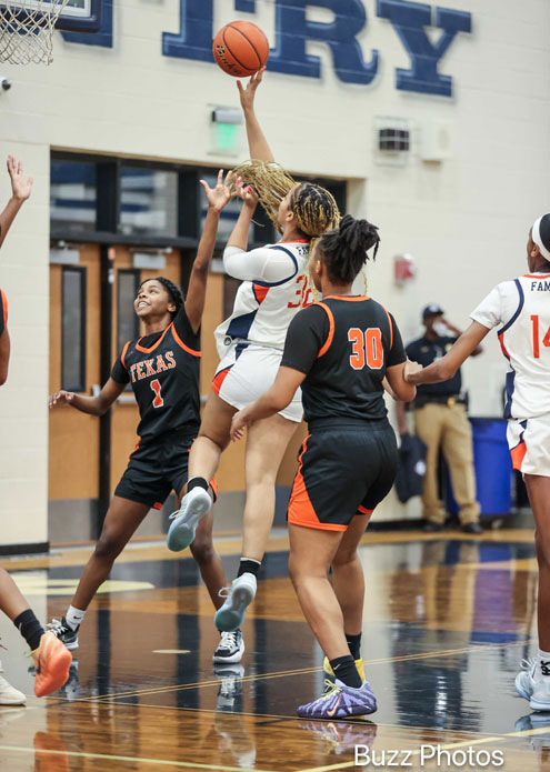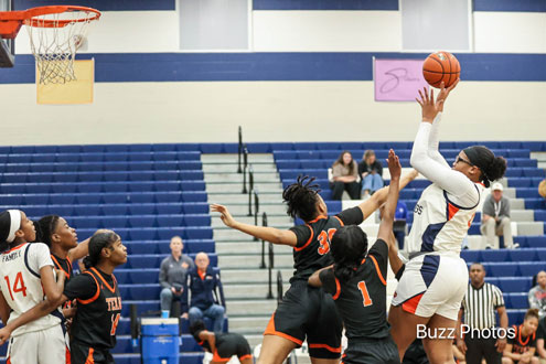 Lady Dawgs freshman Jada Square (#13) shoots for 2 points during a hard fought game against Texas High. The Lady Dawgs won by 2 points in the last few seconds when Jada (#13) made a 3 point shot from the corner to win 38-37 over Texas High (21-4).