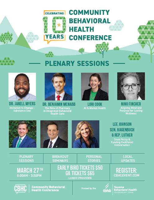 Texoma Region -- The Texoma Behavioral Health Leadership Team is excited to announce the Tenth Annual Community Behavioral Health Conference (CBHC) event is taking place on March 27, 2026, from 8:00 a.m. to 3:30 p.m. at the Hilton Garden Inn Denison in the Texoma Event Center. The conference will bring together professionals, advocates, and community members focused on enhancing mental health awareness and services. This year’s theme, “Inform, Uplift, and Empower,” promises to inspire and educate attendees through a day of insightful plenary sessions, breakout seminars, and personal stories.