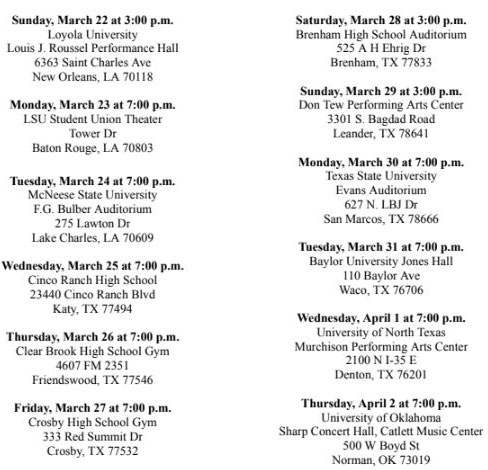 Washington, D.C. – The United States Air Force Band and Singing Sergeants from Washington, D.C., are embarking on a 12-day community relations tour to Louisiana, Texas, and Oklahoma. This tour honors the service of Airmen past and present through a showcase of musical excellence.
