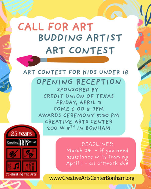 Bonham, Texas -- Creative Arts Center in Bonham seeking submissions of artwork from children and youth from Fannin County! Artwork can be brought to the center during normal business hours between March 17 – April 1, 2026.