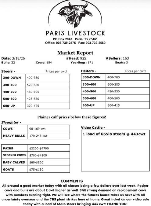Paris Livestock Auction market report