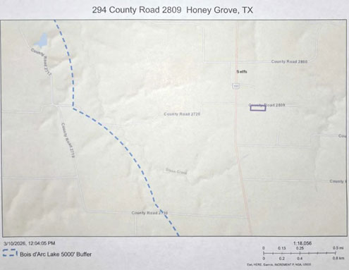 Water line with Bois d'Arc Water is located at the front of the property. This property is located just minutes from Bois d'Arc Lake, Lake Coffee Mill, Horseback Riding Trails and Overnight Horse Trailer Camping, Lake Crockett, Ralph Hall Lake, and the Caddo National Grasslands. Survey to property is available.