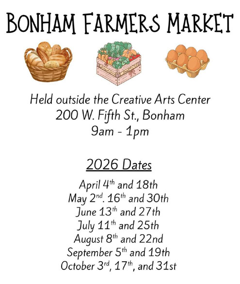 Bonham, Texas -- Bonham Farmers Market is back beginning this Saturday, April 4, and scheduled to run two or three times each month through October!