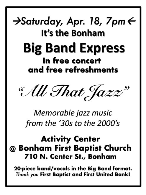 Bonham, Texas -- The next Bonham Big Band Express Concert is slated for Saturday, April 18, 7:00 p.m. in the Activity Center of First Baptist Church, 710 N. Center Street, Bonham.