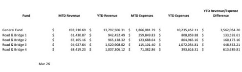 "At the end of March, our General Fund revenue was $13,797,506.31," stated Whipple. "Year-to-date expenses at the end of March was $2,235,452.11."