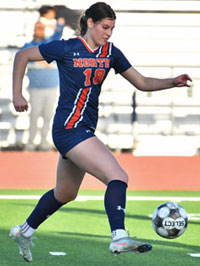 McKinney North Lady Bulldog Sara Bell (18) dominated the midfield with her gritty play in stopping a return kick. (photo by Lockard Koval/BuzzPhotos.com)