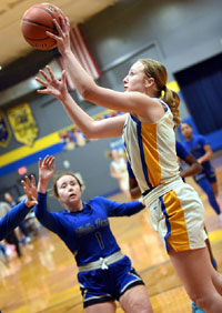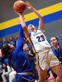 Dodd City's Gracyn Shindler puts up a shot as Savoy's Clover Meadows defends.