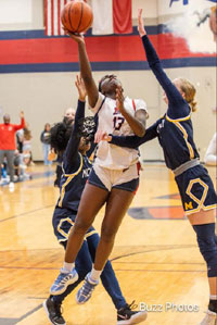 McKinney Boyd Lady Broncos' Ya'din Evans (#13) drives the court for a layup against the McKinney Lions. The Broncos won a hard fought game 68-60 on their home court on January 2nd, 2026. (photo by Buzz Cory/BuzzPhotos.com)